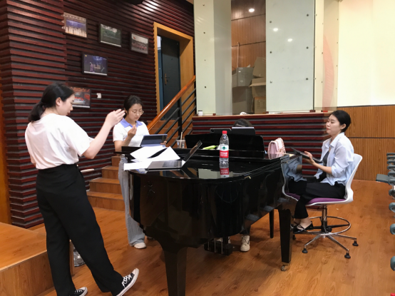 合唱《玉炉香——为女声合唱而作》排练结束,作曲方向研究生侯俊青与指挥郑婧英、艺术指导刘桢蓉讨论演出细节