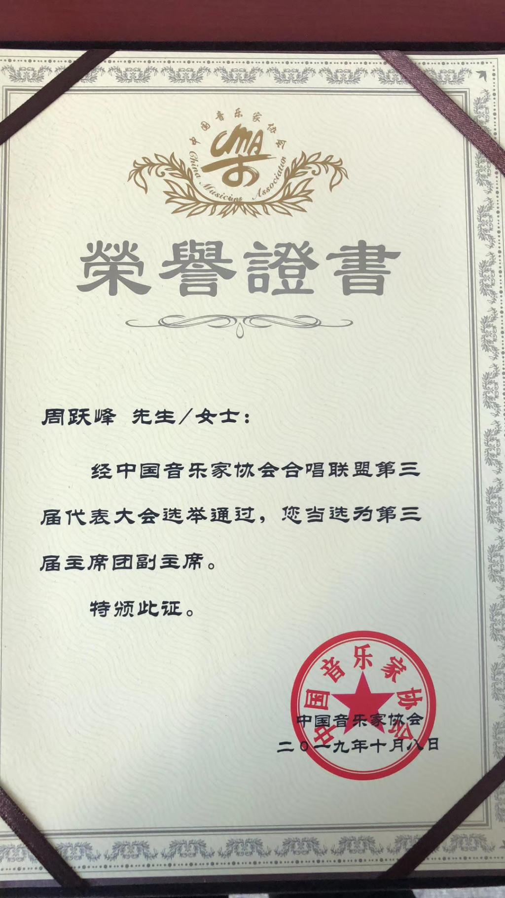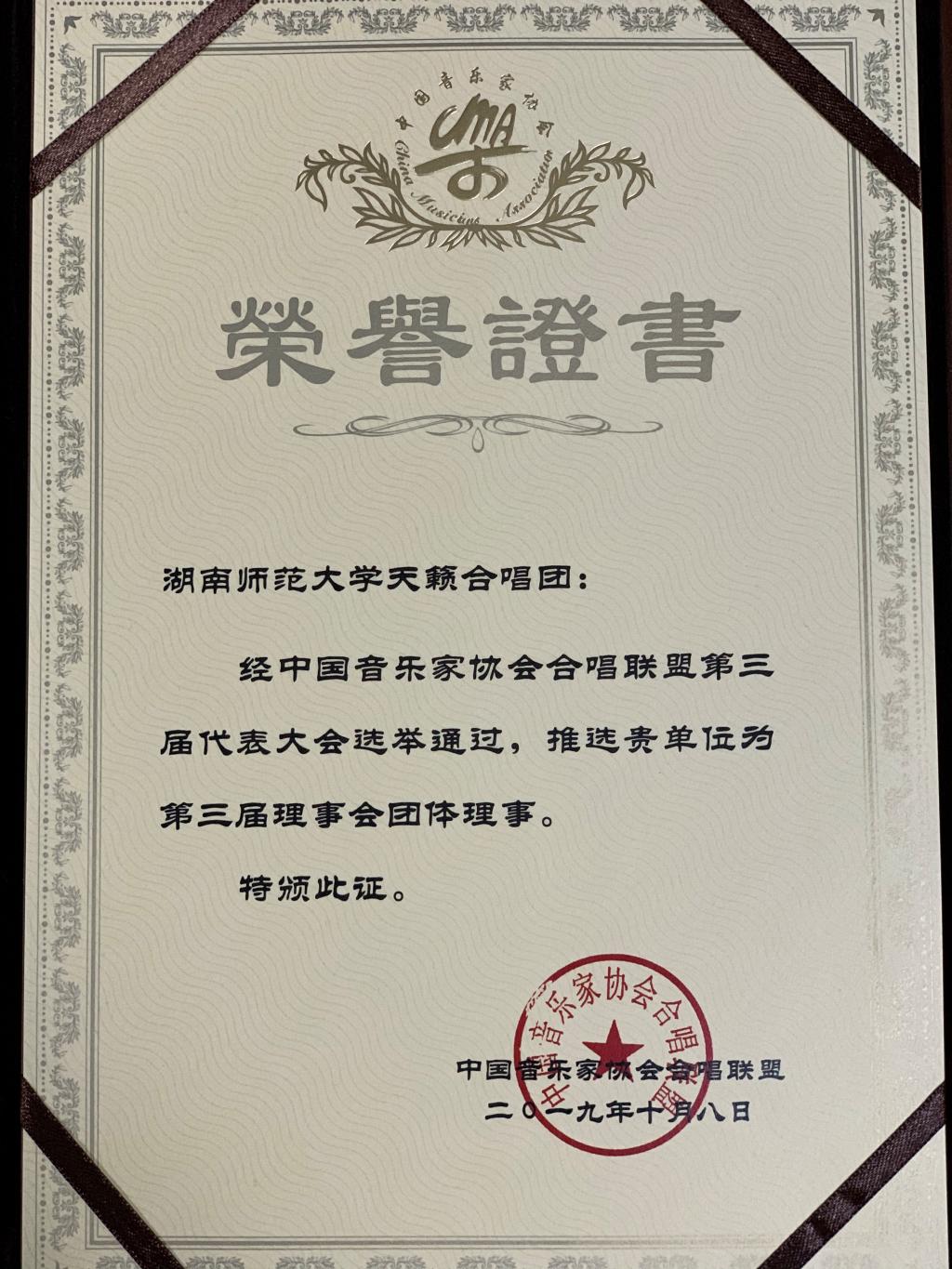 大会选举中国音协副主席、著名作曲家孟卫东为中国音协合唱联盟新一任主席。我校天籁合唱团艺术总监、著名指挥家周跃峰教授当选中国音协合唱联盟副主席,我校天籁合唱团当选中国音协合唱联盟第三届理事会团体理事,这也是湖南省唯一的团体理事。