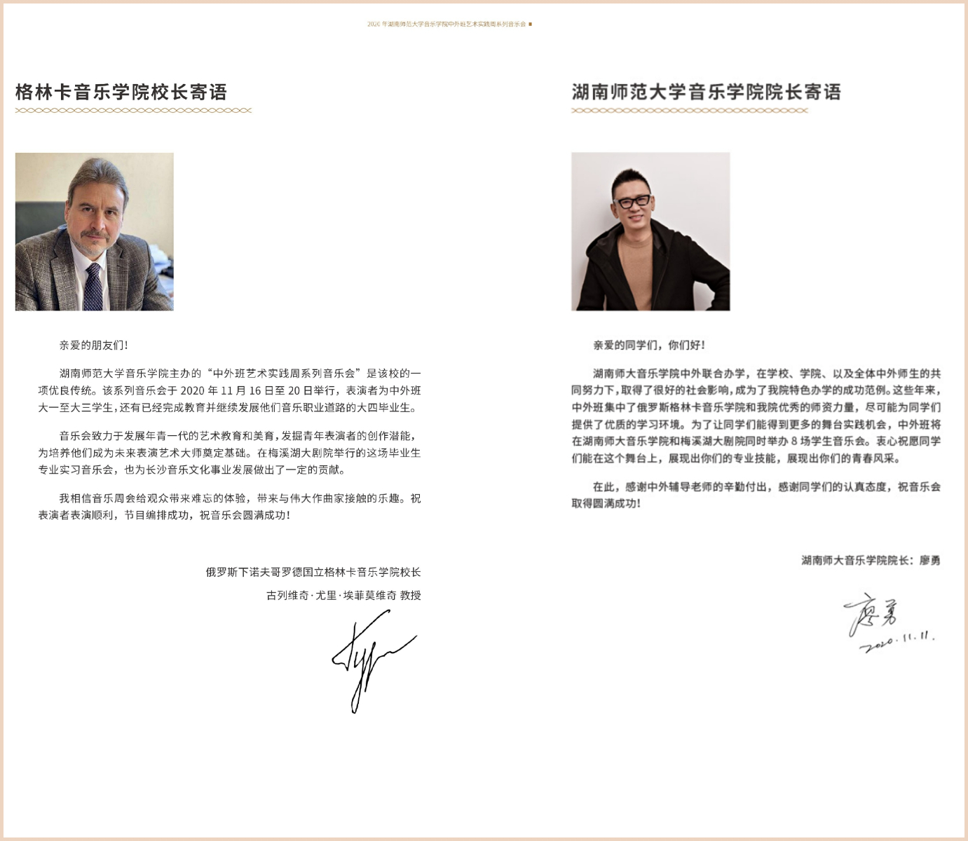 本次活动受到我校和下诺夫哥罗德国立格林卡yl23455永利集团双方领导的高度重视,演出前我院廖勇院长和下诺夫哥罗德国立格林卡yl23455永利集团校长古列维奇·尤里·埃菲莫维奇为本次活动题词,对全体演职人员寄以深切厚望。