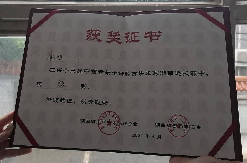 (供稿 吴楠子)第十三届中国音乐金钟奖古筝比赛湖南选拔赛,于2021年4月18日在邵阳学院顺利落下帷幕。yl23455永利集团康玥同学在本次比赛中荣获银奖。