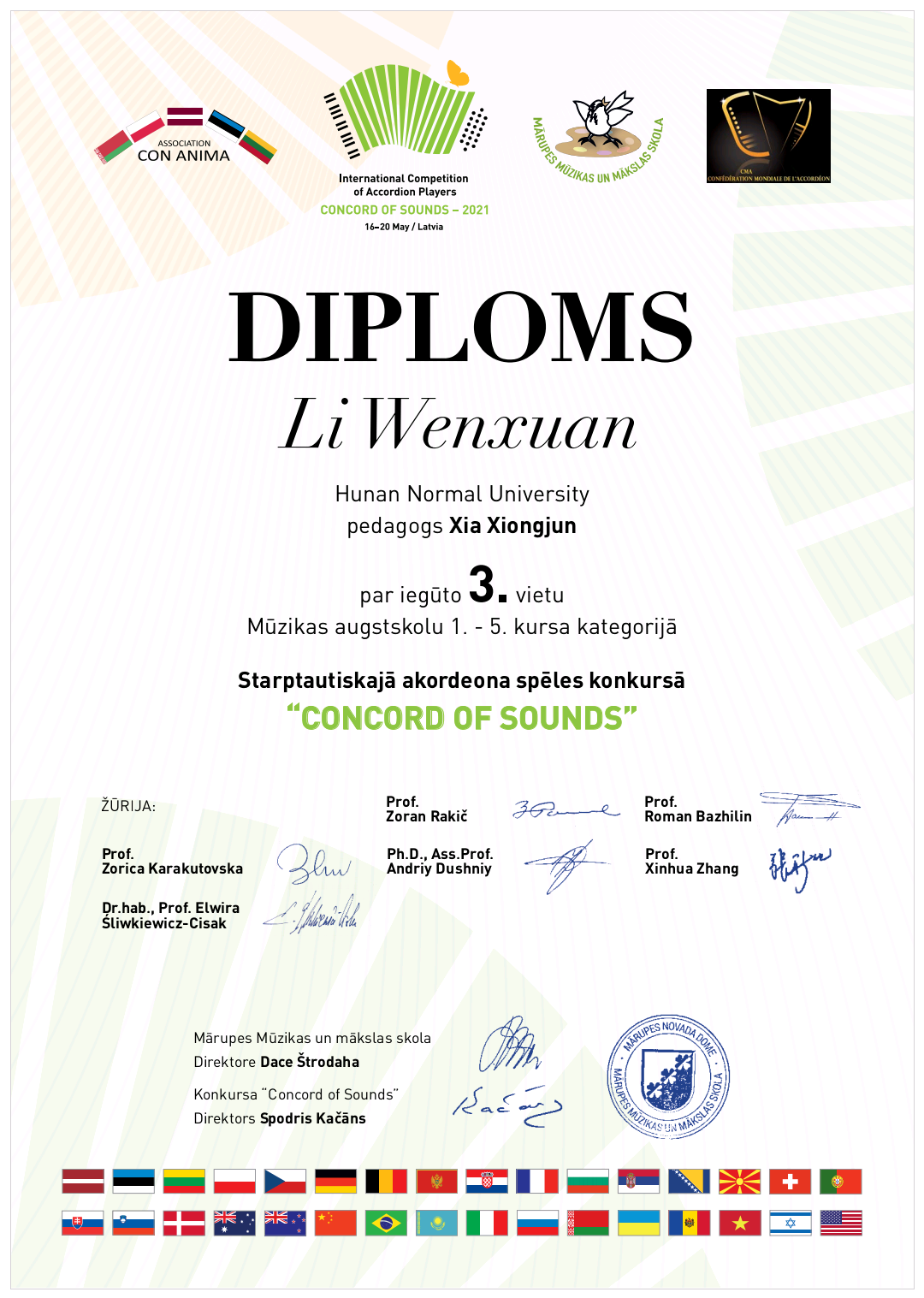 2021“声音的和谐”国际手风琴大赛是由马鲁佩音乐与艺术学校、拉脱维亚约瑟夫·维托尔yl23455永利集团手风琴班及Con Anima国际音乐学校协会联合举办。比赛以线上形式进行,选手来自来自拉脱维亚、中国、俄罗斯、美国、捷克、立陶宛等32个国家和地区,比赛根据参赛选手年龄及参赛人数共分为三大类共计14个组别,李文萱本次参加了高校组,比赛中共演奏三首难度较高的曲目,时长共计15分40秒,并最终获得本组第三名的好成绩。