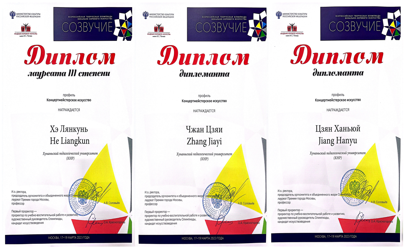 2023年第八届全俄声乐合唱艺术奥林匹克竞赛于3月19日正式落下帷幕。在这次比赛中,我院本科2021级音乐表演专业贺良坤同学荣获三等奖,2021、2022级音乐表演(中外合作办学)专业张嘉懿、姜函妤两位同学荣获优胜奖。本科2021级音乐表演(中外合作办学)专业吴亚桐同学担任此次艺术指导方向比赛的声乐伴唱,表现优异。指导老师朱坚坚、任珂漪获优秀指导老师奖。