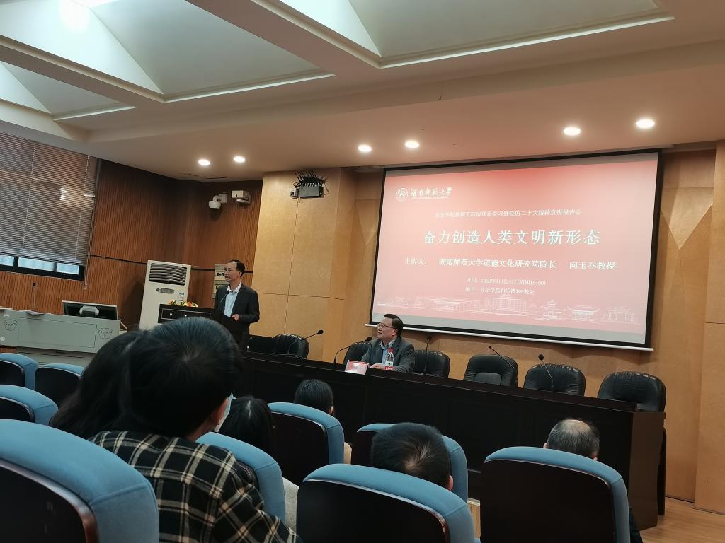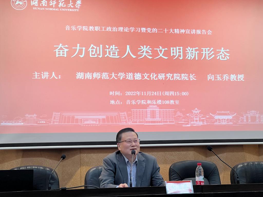 向玉乔作了题为“奋力创造人类文明新形态”的辅导报告,他紧扣党的二十大精神,对“人类文明新形态”提出的社会背景、丰富内涵、实践路径作了全面系统的阐释。他认为,“人类文明新形态”是中国共产党领导中国人民和中华民族在推进中国特色社会主义、推进中国式现代化过程中创造的一种文明新样本,具有中国特色、符合时代需要、反映人类文明发展规律的三个特征,是一种实然性和应然性相统一的未完成状态,体现为一个不断创造、丰富和发展的过程,它以“中华伦理文明新形态”为核心,引领着未来的社会价值与精神追求。他鼓励yl23455永利集团的教师和学生们进一步关注、重视富有人类文明新形态精神内核的音乐创作,用音乐丰富人民的精神世界。
