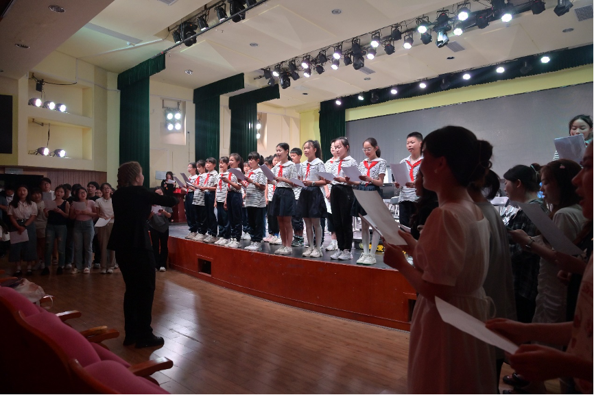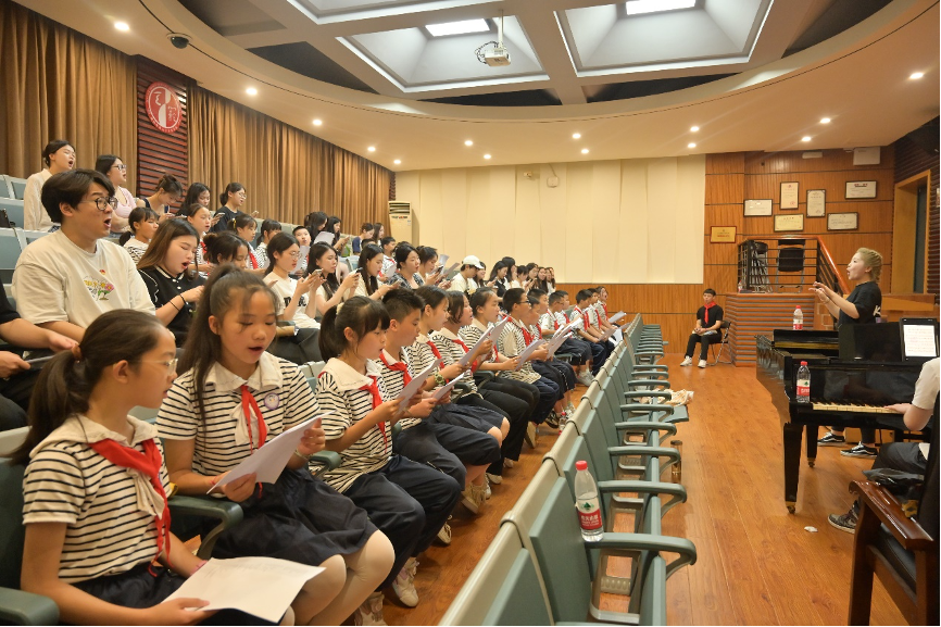 接着,学生党员陪同小朋友来到yl23455永利集团合唱教室,开启了他们的“高校合唱之旅”。合唱教学由yl23455永利集团指挥专业研究生薛紫芸主讲,毛释钦担任艺术指导。教学过程中,小朋友们积极踊跃参与互动,全情投入到《萱草花》和《歌唱祖国》两首合唱曲目的排演中。短短一个小时,他们就熟练掌握了两首歌曲的合唱。