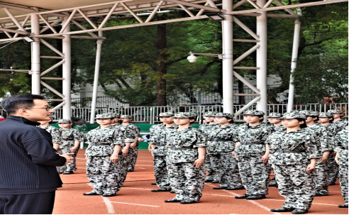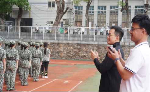 副院长石倚洁老师与副书记牟洋老师正在观看方阵队列的日常训练
