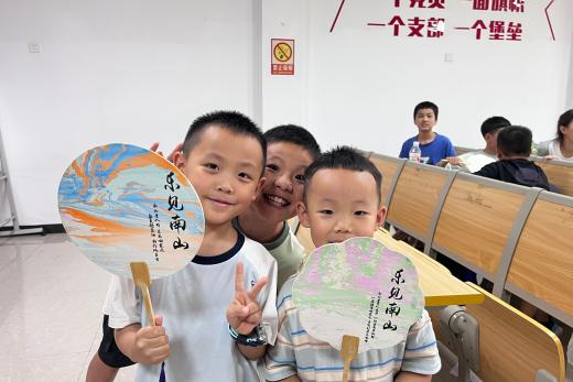 活动伊始,主讲人借助PPT向孩子们详细讲解了漆扇的历史渊源、精湛的制作工艺以及丰富的文化内涵。随后,在主讲人的示范下,一场别开生面的漆扇创作之旅悄然开启。孩子们兴奋地拿起自己的小扇端详,一双双亮晶晶的眼睛里满是对传统漆扇技艺的好奇与期待;接着,把各自选好的颜料依次滴进水桶里,手握小扇将扇面缓缓浸入水中,让颜色均匀附着在扇面上。在实践团成员的细心指导下,一个个充满童趣的漆扇作品陆续呈现。等漆扇晾干后,孩子们迫不及待地举起自己的作品互相展示。“你看我的像不像彩虹?”“我的上面有一只小蝴蝶呢”,孩子们个个脸上满是自豪,传承非遗文化的嫩芽已然在每个孩子心中悄悄破土。