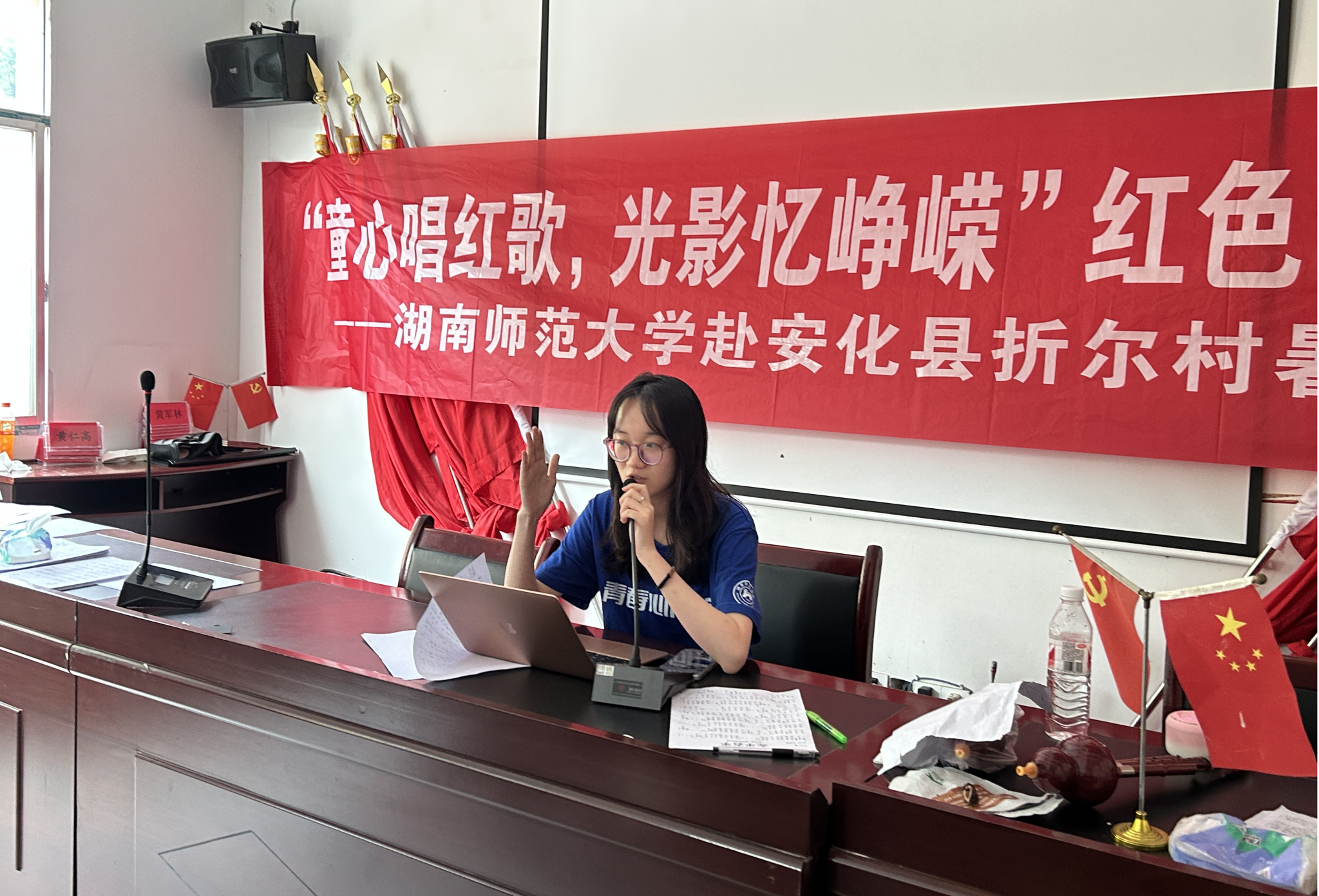 活动以“童心唱红歌,光影忆峥嵘”为主题。主要分为两个板块,第一个板块是讲好党史故事,实践团成员通过生动有趣的讲述,将党的光辉历程呈现在孩子们眼前;第二个板块是铭记抗日历史,让孩子们深刻了解那段艰苦卓绝的岁月。板块与板块之间还穿插了对革命歌曲的介绍与赏析,当实践团成员领唱《红星歌》时,孩子们纷纷认真聆听,小声跟唱,手中的小红旗随着音乐节奏挥舞,仿佛置身于那段激情燃烧的岁月,真切感受着音乐中蕴含的强大力量。