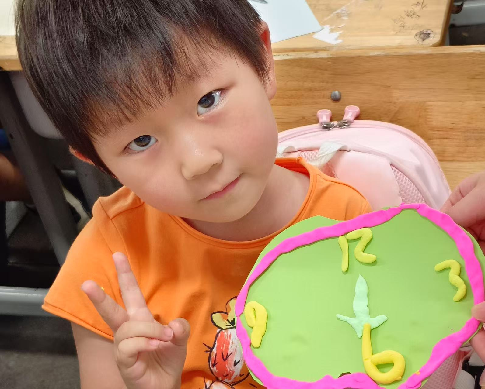 课堂伊始,实践团成员以故事引入主题,向学生们讲述达利创作《永恒的记忆》时“融化时钟”的灵感来源。实践员们通过互动提问,引导学生们打破对“时间”的常规认知,鼓励他们用童趣视角重新诠释艺术。孩子们用彩色卡纸剪出不规则表盘,以粘土捏制时针、分针,并自由装饰时钟主题,将童话般的想象倾注于作品中。最后他们的作品以天真烂漫的方式,展现出对经典艺术的个性化解读。