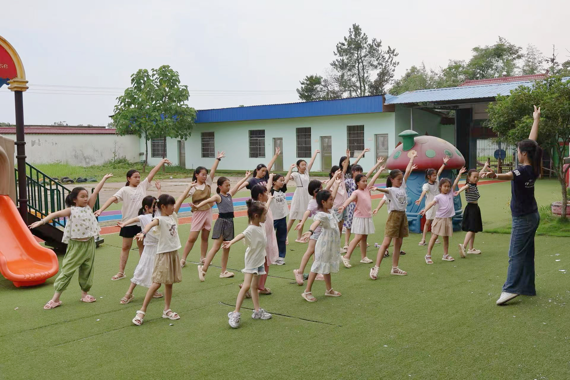 本次教学相较以往,不仅特色更为鲜明突出,内容也更加丰富多元,展现出更具活力的教学风貌。舞蹈组根据孩子们的喜好和性别进行分班教学:街舞《青春炫舞团》让孩子们在动感节奏中释放活力;古风《长街万象》以柔美舞姿培育审美情趣;武术《天地龙鳞》用刚劲动作锤炼意志;小班《阳光男孩阳光女孩》通过简单舞步提升肢体协调性。器乐组在教授了学生关于口风琴的基础知识后,综合考量孩子们的兴趣和接受程度分为大班和小班:大班演奏《栀子花开》,在悠扬的旋律中培养乐感;小班学习《同桌的你》,从基础音符的掌握中强化识谱能力。朗诵组则聚焦《小梦想、大世界》,通过气息训练与情感表达指导,帮助孩子们学会自信发声、大胆表达,同时还与合唱组进行联动教学,将朗诵技巧运用于歌唱之中。合唱组在教授完发声技巧与基础音阶后也进行分班教学:大班学唱《紫荆花盛开》,用温暖的歌声传递家国情怀;小班演绎《青苹果乐园》,以轻快节奏激发歌唱兴趣。手工组精心筹备了彩纸、扭扭棒、扇面、染料等丰富材料,带领孩子们沉浸式体验彩纸拼贴画、扭扭棒手环、手工扇绘制、漆扇创作及扎染工艺。孩子们在剪裁粘贴、调色晕染的过程中,不仅锻炼了精细动作与动手能力,更在自由创作中迸发奇思妙想,点燃了对传统工艺与艺术创造的热情,收获了满满的成就感。