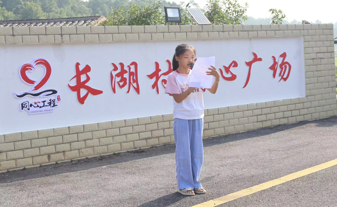 活动第一项,出旗。由学生代表与实践团成员组成的护旗方阵,伴随着铿锵有力的《义勇军进行曲》,迈着整齐的步伐护送国旗至升旗台。活动第二项,升国旗、奏国歌。实践团成员毛端担任升旗手,在雄壮的国歌声中,五星红旗冉冉升起。全体师生肃立致敬,齐声高唱国歌,展现昂扬向上的精神风貌。活动第三项,学生代表郭佳缘作国旗下讲话。她回顾去年夏令营的美好时光,分享在活动中收获的成长与友谊,并号召大家以最佳状态投入本次汇报表演。活动第四项,长湖村党总支部委员、乡村相见小院主任周姣作总结发言。她提到夏令营为长湖村注入新活力,充分彰显了美育对乡村发展的积极作用,同时勉励孩子们:“要以此次活动为契机,把红色精神转化为学习的动力,脚踏实地、勤奋进取,既学好知识本领,也锤炼品德修为,将来用奋斗书写青春,用本领建设家乡。”这份来自基层工作者的殷切期望,进一步坚定了大家奋进前行的信心与决心。