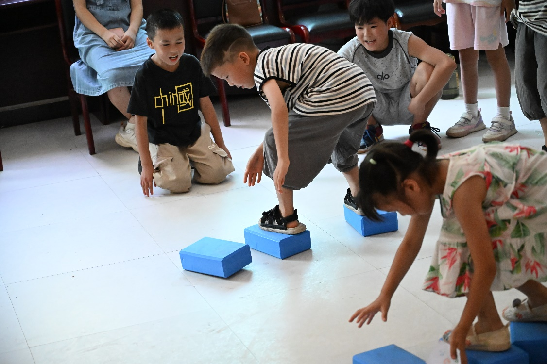 活动前,实践团成员详细讲解规则并鼓励孩子们“放开玩、大胆比”。团体赛中,趣味拔河迅速点燃全场氛围,数名孩子扎稳马步齐喊口号,红布在绳间激烈摆动;穿越呼啦圈环节,孩子们手拉手让彩圈“飞”转,其中一支队伍仅用15秒完成挑战;50米接力赛场上,孩子们手持接力棒往返冲刺,呐喊声此起彼伏。个人赛中,孩子们以瑜伽砖“过河”、短棍“赶小猪”,锻炼并展现了平衡能力与运动技巧。
