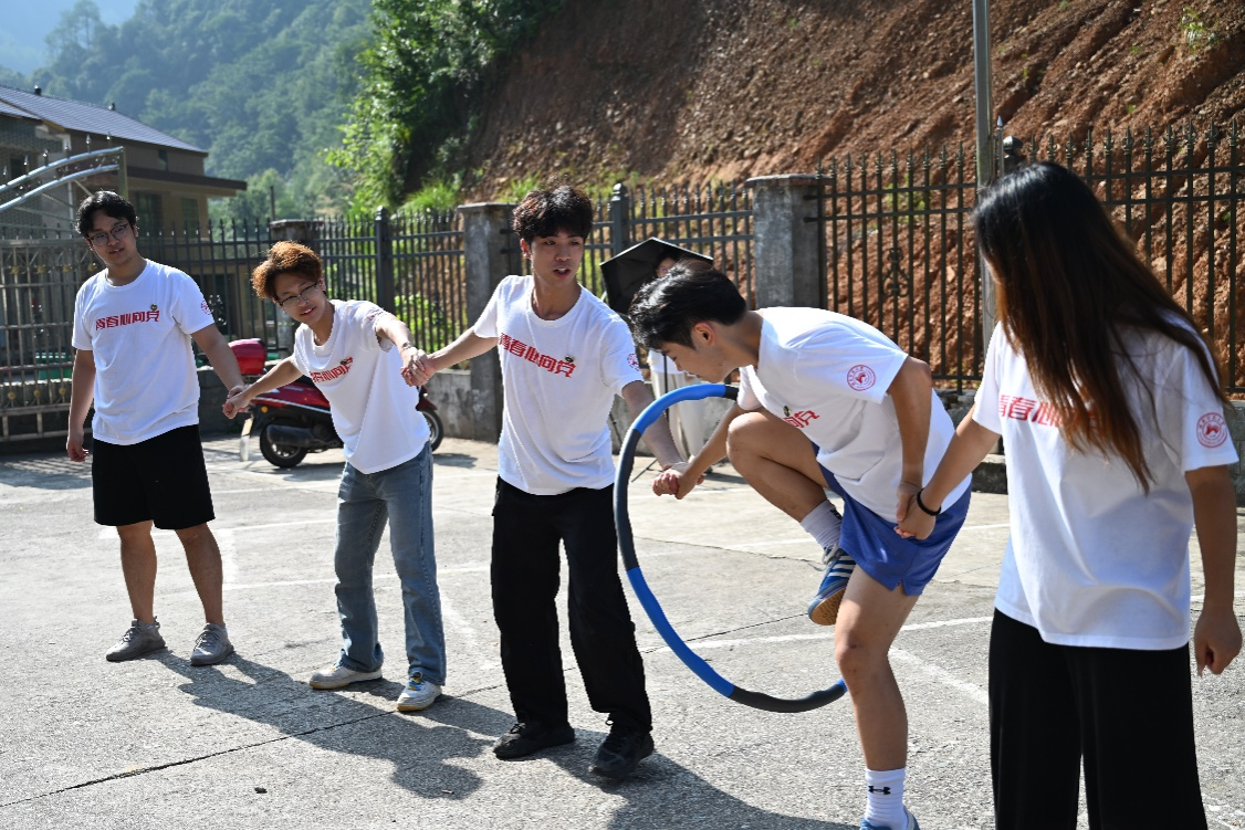 图为实践团成员示范穿越呼啦圈