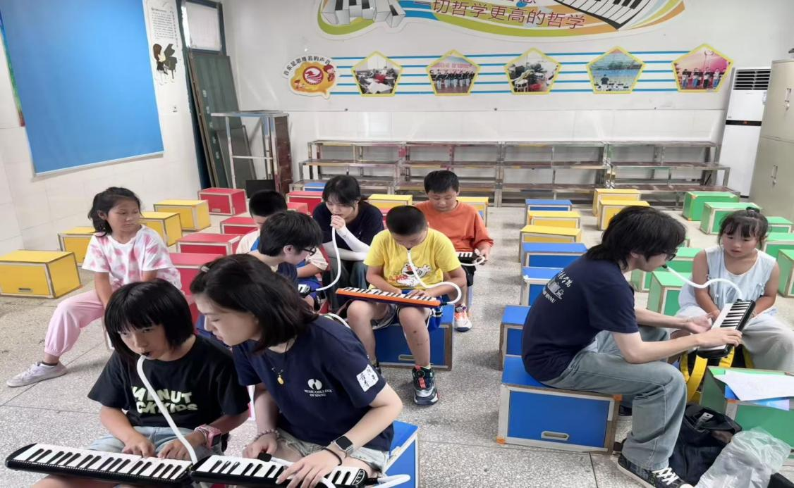 实践团采用"专业引领+趣味互动"的教学模式开展首日课程。在合唱课堂,以《萱草花》为教学曲目,通过拍手、跺脚等互动方式培养音乐感知能力;舞蹈课上,学生们在古典舞基础训练中感受肢体语言的魅力;口风琴教学以《小星星》为载体,循序渐进地引导学生掌握吹奏技巧;手工课则通过创意折纸激发学生的艺术想象力。