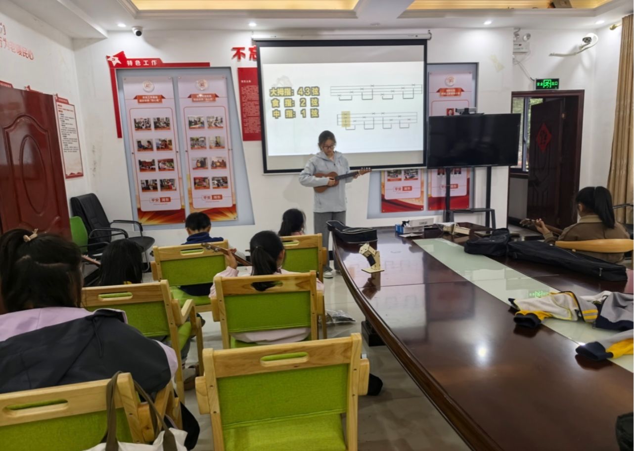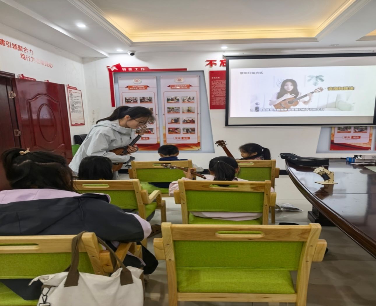 本次课程中,志愿者们先带领小朋友复习和弦知识并开展和弦连接练习,帮助大家筑牢音乐理论基础;随后,志愿者们系统讲解常用拨弦方法,指导小朋友们进行曲目的演奏练习,让大家在实践中稳步提升演奏技巧。课堂上,孩子们带着十足的热情大胆尝试、勤加练习,从生疏摸索到熟练掌握和弦连接技巧,成功让一串串和谐动听的旋律在指尖流淌。