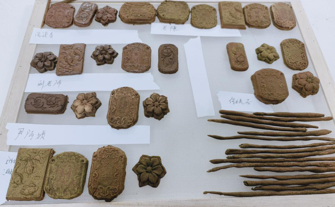 活动伊始,志愿者们为老人们介绍了檀香、桂花、艾草等不同类型香粉的来源与功效,如檀香可安神静气、桂花能清新解郁,并通过香粉气味的对比,让老人们直观感受每种香粉的独特韵味。随后,在志愿者的指导下,老人们开始动手调配香泥。过程中,志愿者们轻声讲解调配的技巧,并手把手协助他们调整香泥的干湿程度。最终,在志愿者的陪伴下,老人们都顺利完成了自己的古法香牌,有的是复杂的莲花纹样,有的是简洁的圆形佩饰。大家捧着自己的作品,脸上洋溢着满足的笑容,纷纷表示感受到了传统技艺的乐趣与魅力。