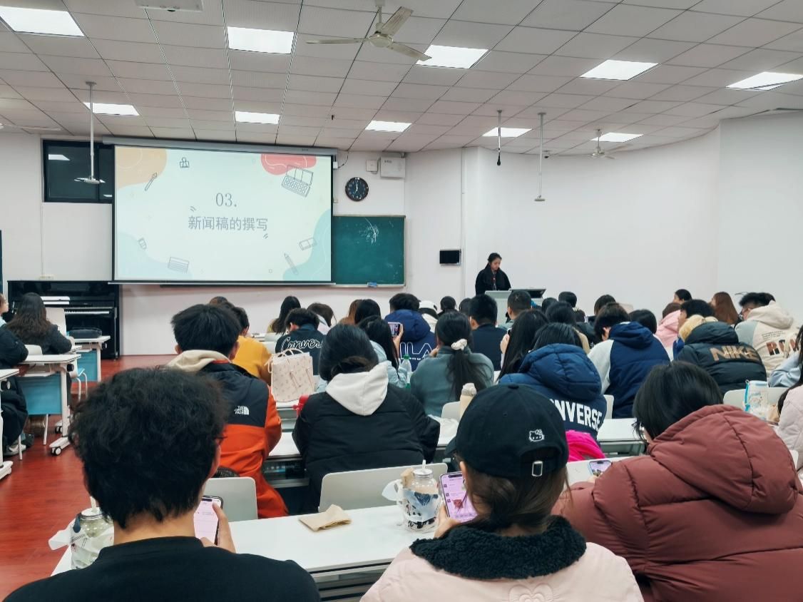 本次培训聚焦于新闻稿撰写与推送制作实务。张绮珊详细讲解了推送编辑与排版的核心要点,强调统一视觉风格、提升内容可读性的关键方法;李星怡介绍了封面图的设计原则,突出主题一致与视觉吸引力的实现路径;竺梦媛则系统解析了新闻稿的写作规范及不同平台的投稿要求,着重强调了内容准确与语言严谨的重要性。随后,三位主讲人结合实际案例进行演示,并在现场指导学员逐步操作, 学员们认真听讲、积极互动,现场学习氛围浓厚。