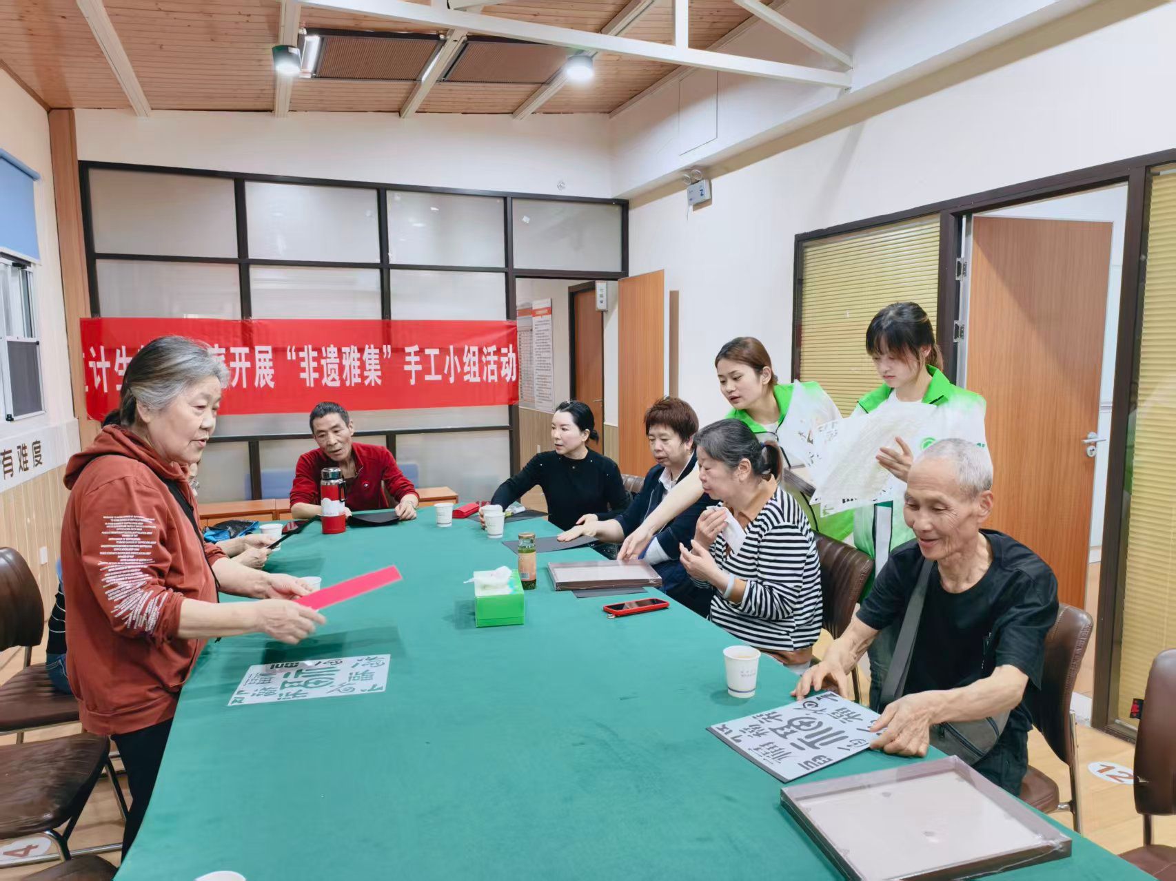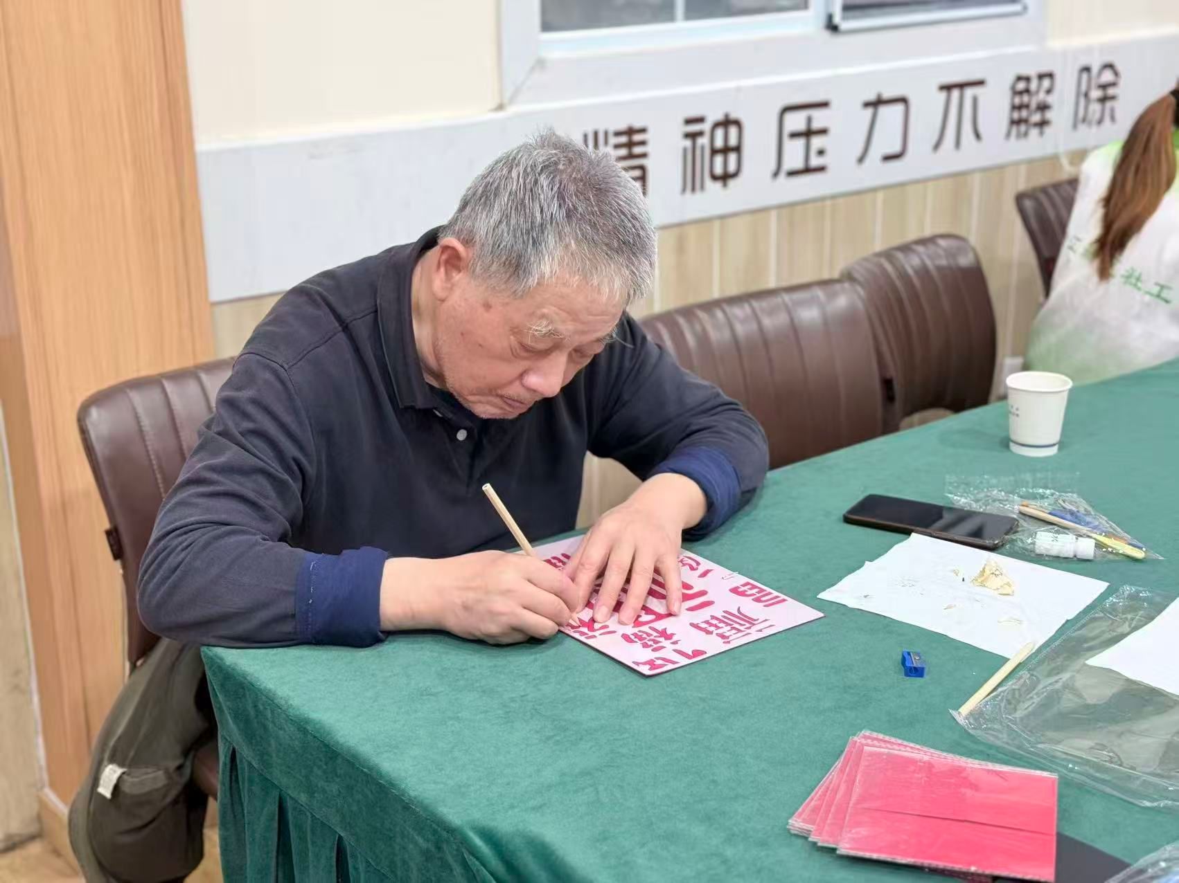 活动现场,志愿者们全程耐心引导,细致讲解并示范金箔福字的制作流程与操作要点。老人们在志愿者的协助下,依次进行描边、涂胶、贴箔等工序,认真投入手工制作。过程中,大家相互协助、交流心得,现场氛围温馨融洽。完成作品后,老人们捧着自己亲手制作的黑底金福,脸上洋溢着幸福与满足的笑容。