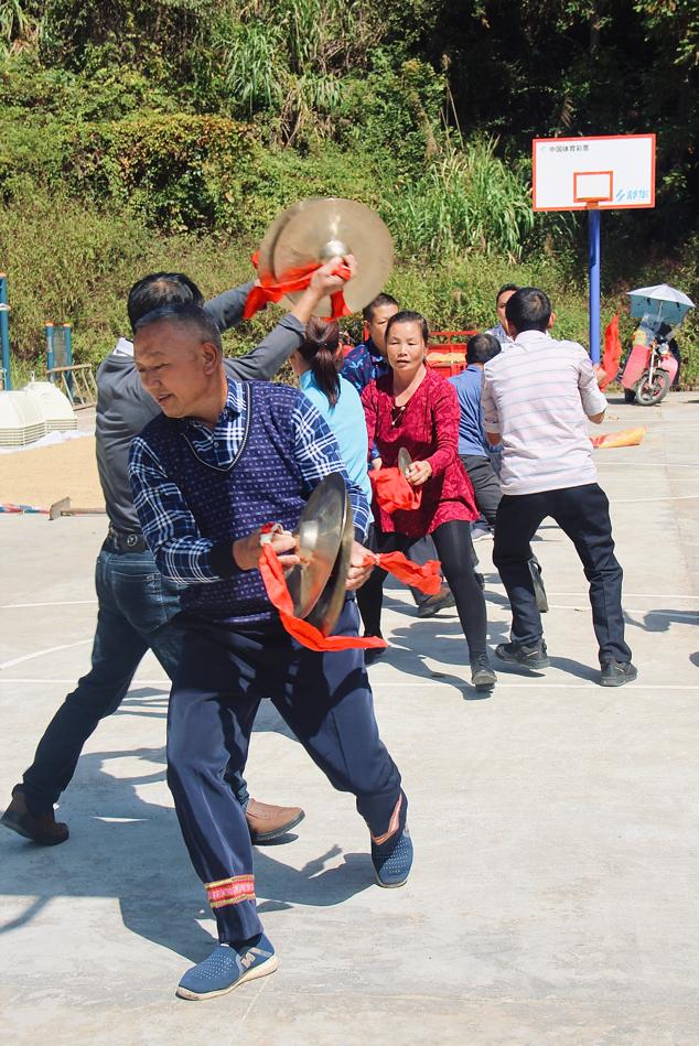 下午2点30分,江华表演队聚集在田冲村村委会前坪进行排练。为了舞台空间中观众的直接观感,现场呈现比较完美的表演状态。当地民间表演队积极主动地参与排练,排练过程认真高效。众人双手持乐器敲击,两人相向绕身而过“穿五角梅花”;俯身“鸡公啄米”、拧腰“鸡公摆尾”......在谢春团队与表演队相互配合下历时4小时完成了作品整体画面的编排。村民们向团队表示自己真挚的感谢,并邀请团队再次到来。谢春也表达了对于日后携手合作的强烈意愿,并对这个作品在图腾园广场的舞台空间最终呈现效果表示了热诚的期待。