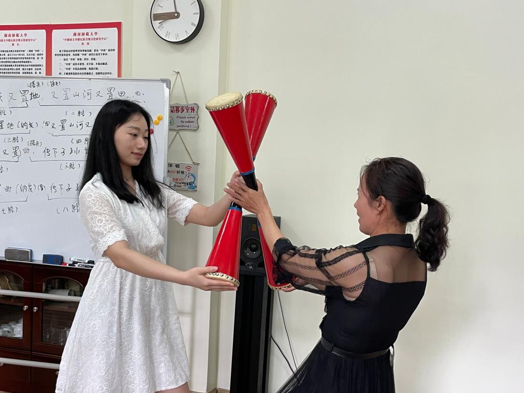 图3:李星星博士向赵喜兰老师学习长鼓舞