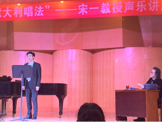 讲座中,宋一教授讲解了正确的呼吸方法,强调唱歌时要保持吸气时的状态,并和大家一起欣赏了由我院陈世扬副教授示范演唱的《我的太阳》。接着,宋一教授现场指导了五位学生。根据这五位学生的个人情况,教授分别从换气、咬字、情感等方面对学生们进行了耐心的指导,并进行了示范教学,以便于听众们更加直观的了解“意大利唱法”。会议最后,教授一一解答了学生们的提问,教授强调学习声乐是一个长期的过程,要终身学习,要经常反思。