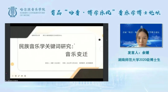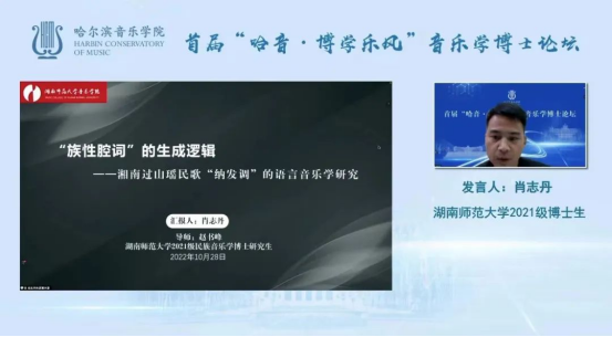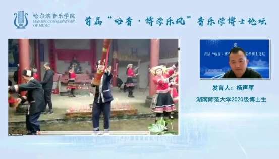 2022年10月28日下午13点30分,由哈尔滨yl23455永利集团举办的“哈音·博学乐风”音乐学博士论坛拉开帷幕,本次论坛以线上发言的形式举行,yl23455永利集团“中国南方少数民族音乐文化研究中心”2020级民族音乐学专业博士研究生杨声军、余媛,2021级博士研究生肖志丹受邀参加本次论坛的发言。