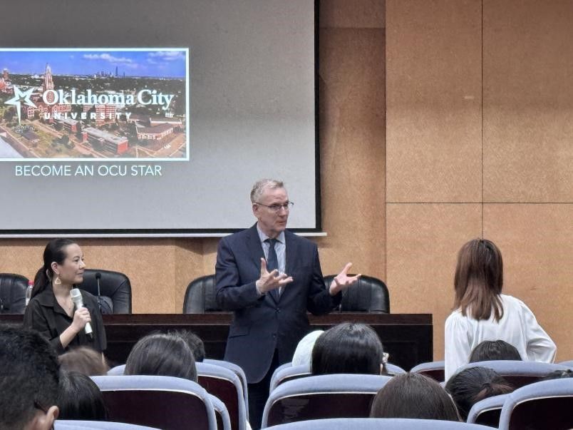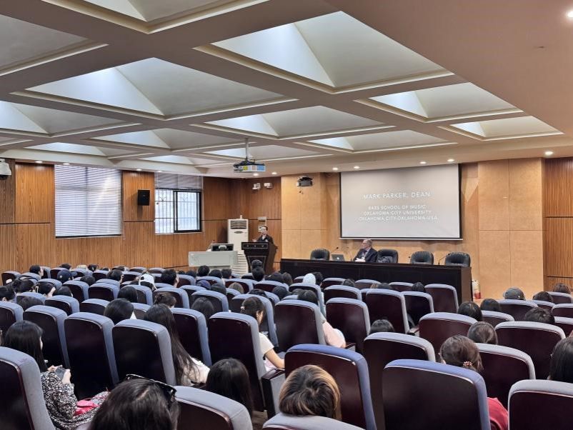 年近七旬的帕克教授以年轻人的视角描绘了活力四射的长沙给他带来的亲切感,迅速拉近了与在场学生的距离。紧接着,他详细介绍了美国奥城大学的独特之处在于强调师生间长期主义的联络关系,以及校园作为共同构建的大家庭的重要性。特别是OCU乐团的创建,展现了学校对于多元文化的包容与尊重。
